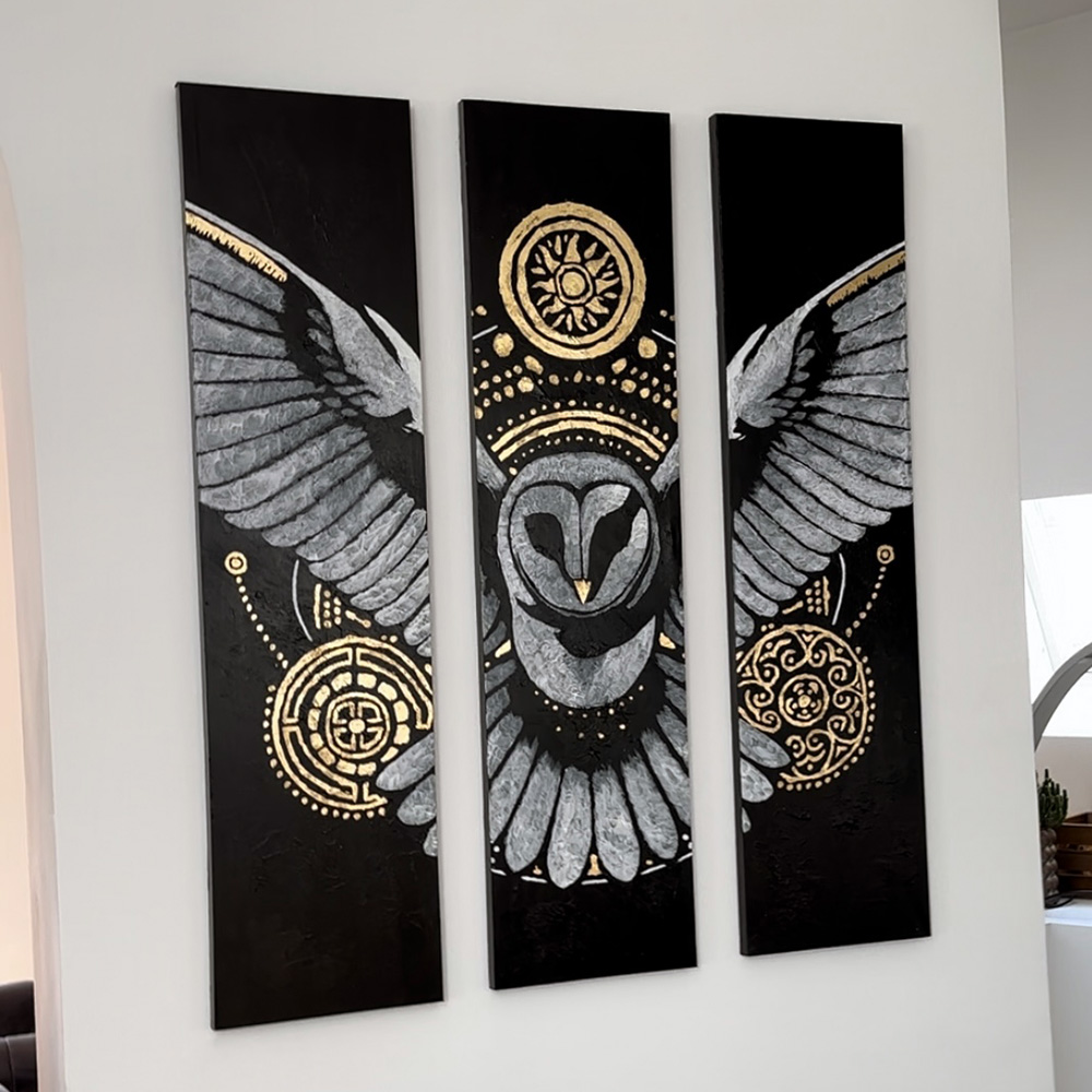 This triptych captures the essence of the majestic owl—a timeless symbol of wisdom, mystery, and new beginnings. With striking black-and-white contrasts and the elegance of gold leaf, it radiates a powerful, captivating presence.